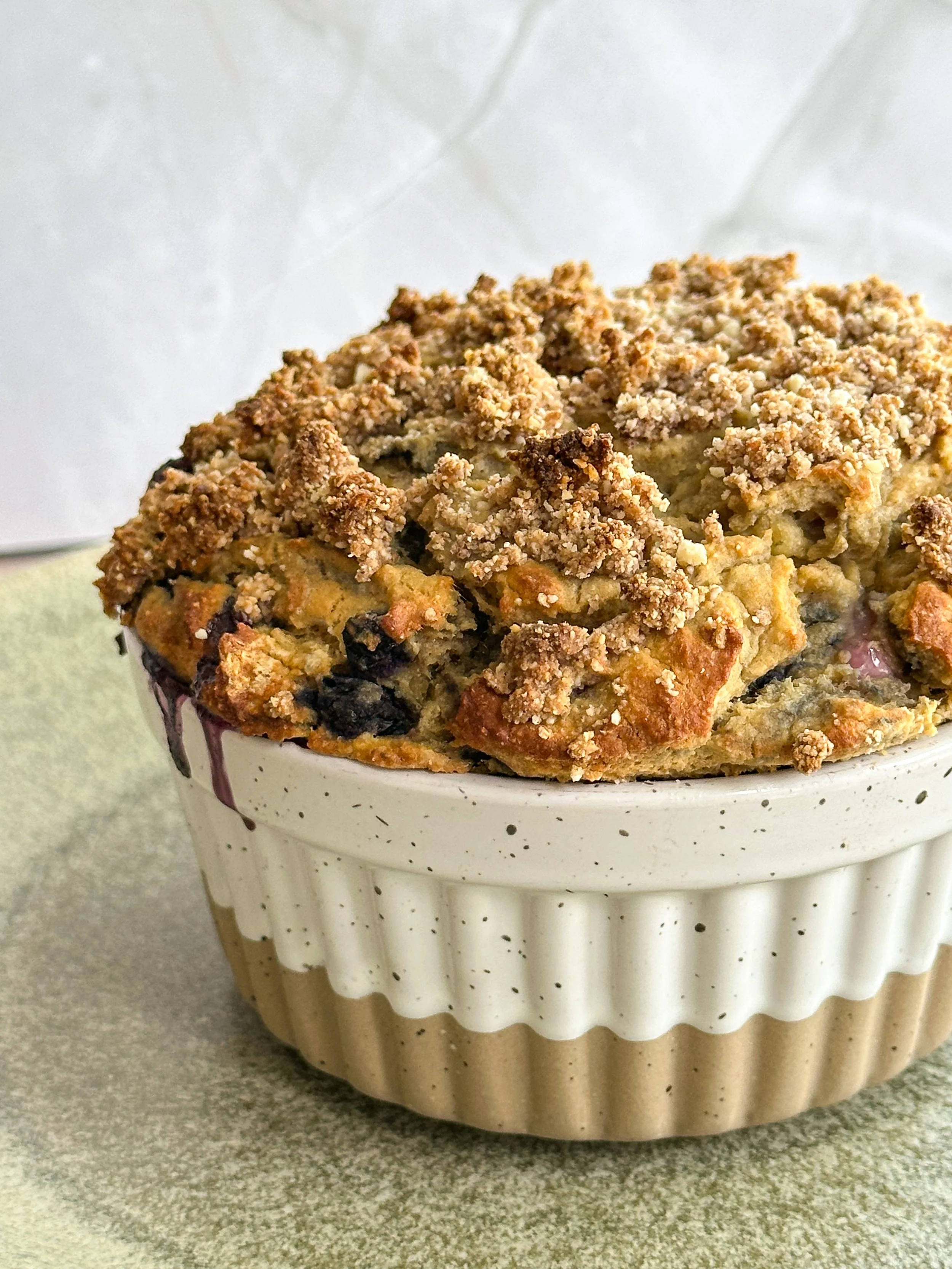 A cozy single-serve baked oatmeal that tastes like blueberry coffee cake but is secretly high in protein and made with better-for-you ingredients.
