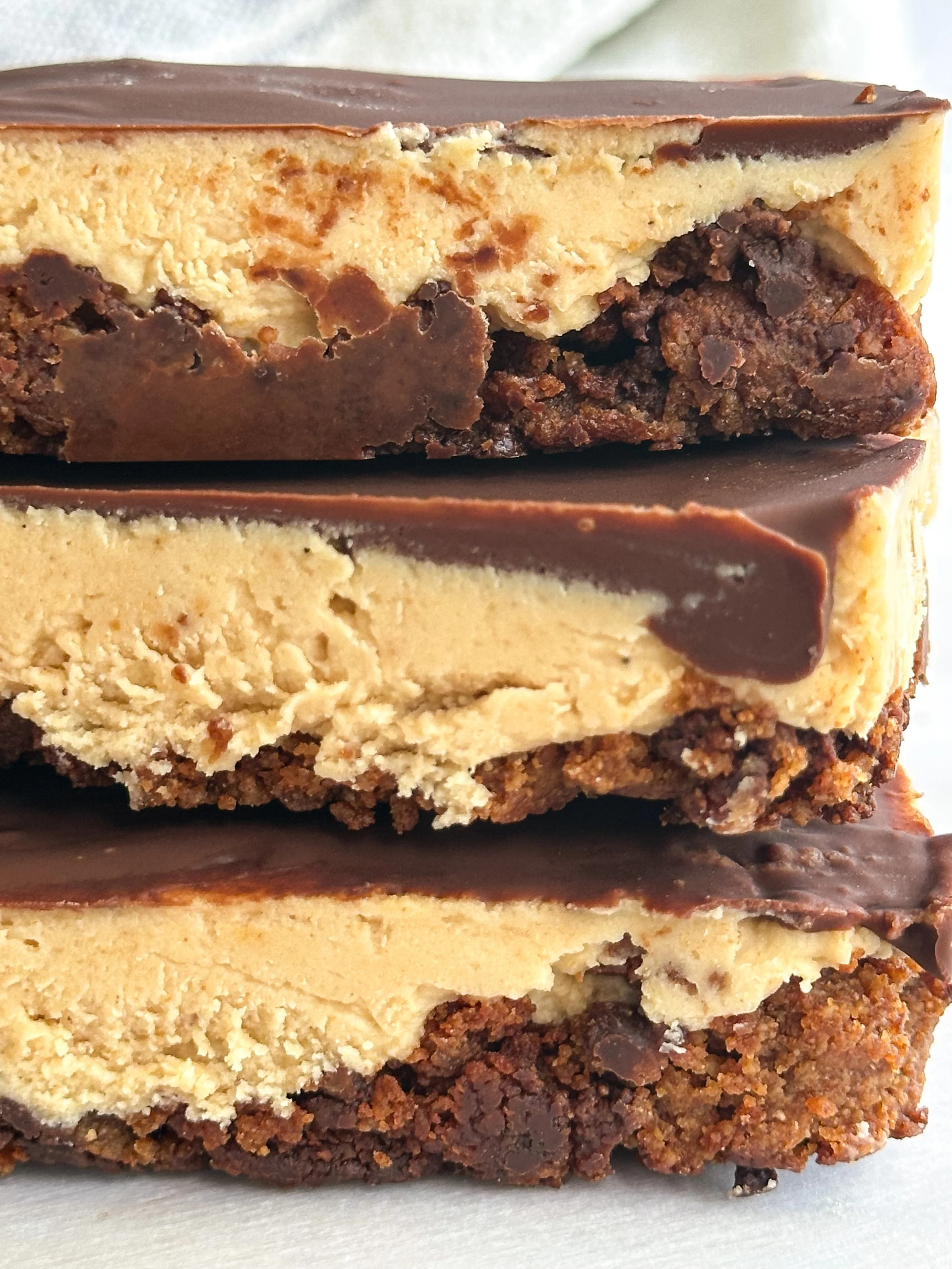These no-bake peanut butter chocolate chip cookie cheesecake bars are high protein, gluten-free, and freezer-friendly. Made with Truvani bars and dark chocolate!