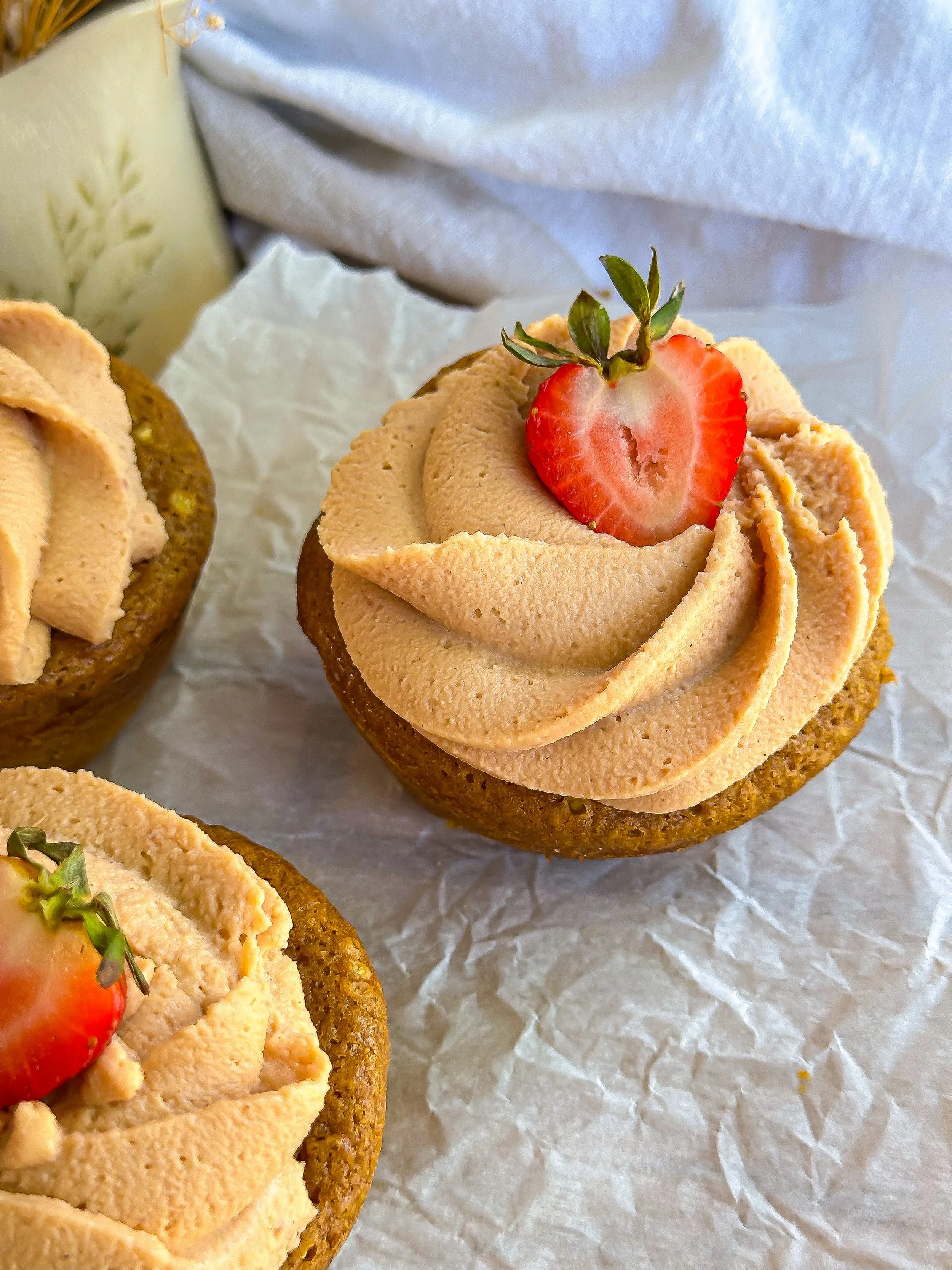 These Strawberry Cheesecake Cupcakes are fluffy, fruity, and finished with a creamy strawberry protein frosting. Each cupcake has a hidden strawberry jam center for a fun twist on classic cheesecake flavors.